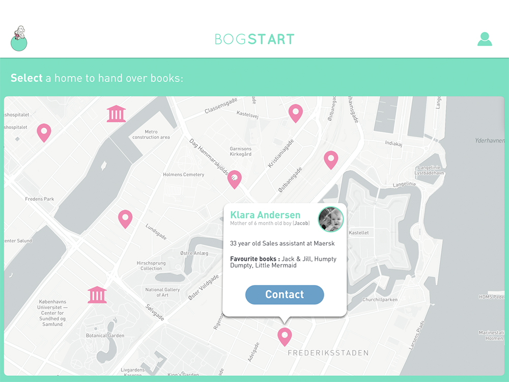 BogStart is a collection of curated books for the ages 6 months, 12 months and 18 months. The family receives the first set of books at the door from a volunteer when their child turns 6 months old. A half year later, they receive a notification, that it is time to pass on the books to another family. Using an online map, they are able to see whom the books can be delivered to. When they have decided a fitting location, the family passes it on to the family with the younger child than theirs. Here the families can share knowledge and give recommendations.