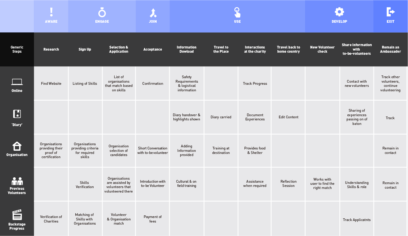 The project started with desk research and conducting in depth interviews with over 15 people, including current volunteers, to be volunteers and volunteer recruiters. In addition to this I also conducted some guerrilla research in spaces like hostels and schools.